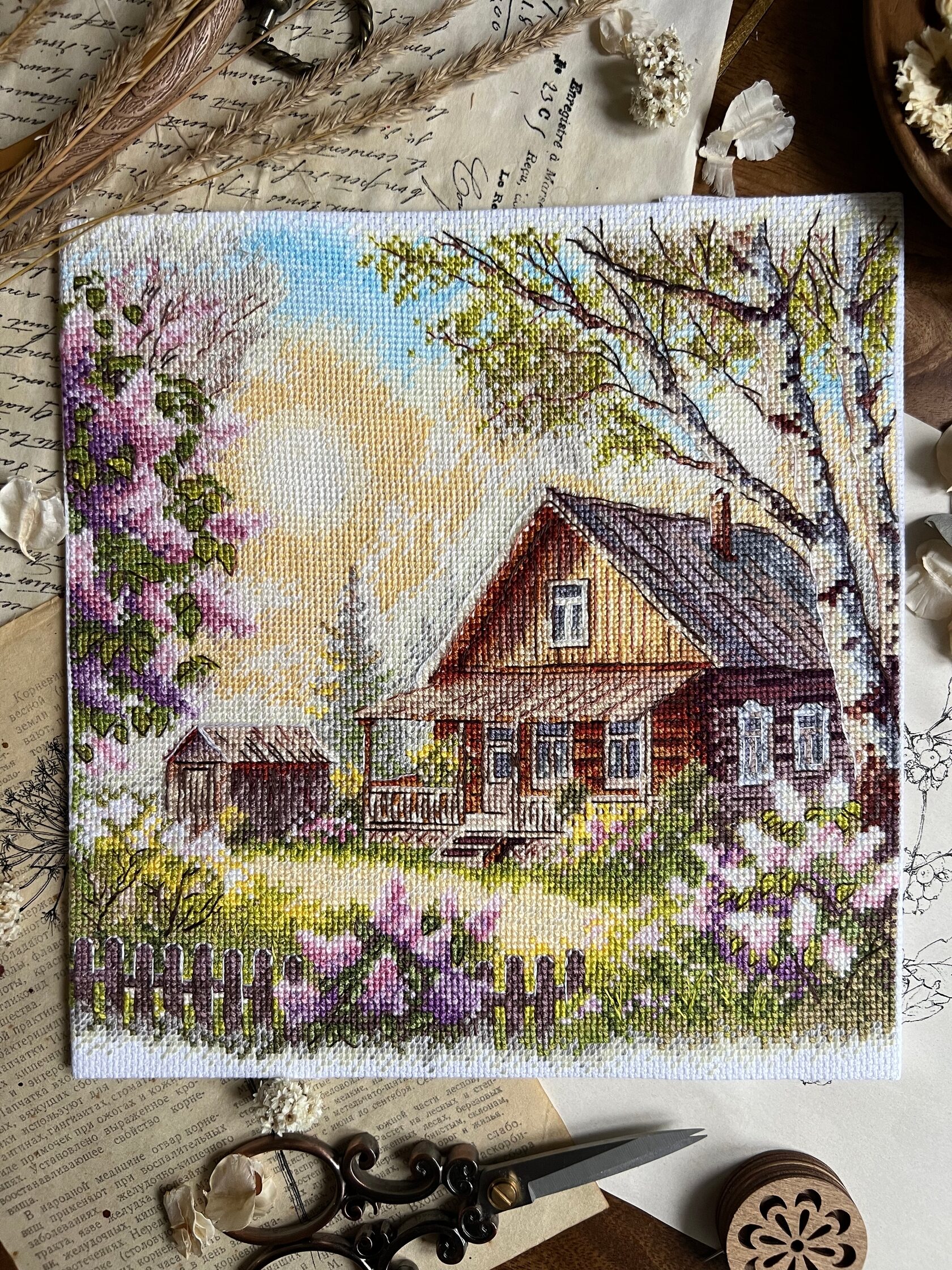 Дом под солнечным небом, густые сиреневые кусты и лёгкий ветер, который шевелит занавески — в каждом крестике живёт уют и воспоминание о доме, где тебя ждут.