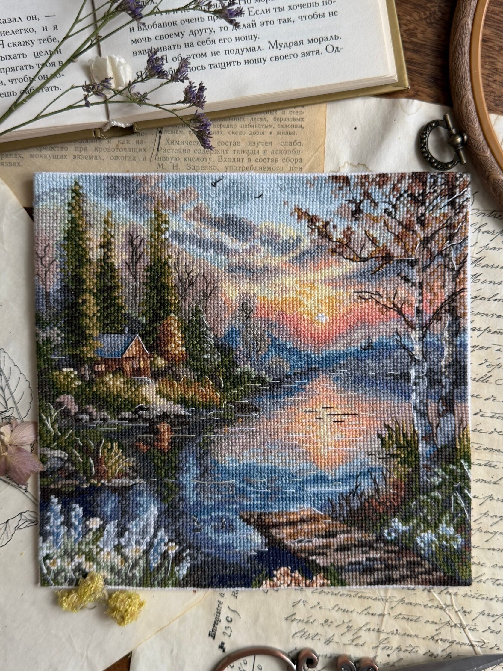 В больших городах мы всё время куда-то спешим. А здесь — вечер у воды, где день будто замедляется. И когда вышиваешь этот пейзаж, внутри тоже становится тише.